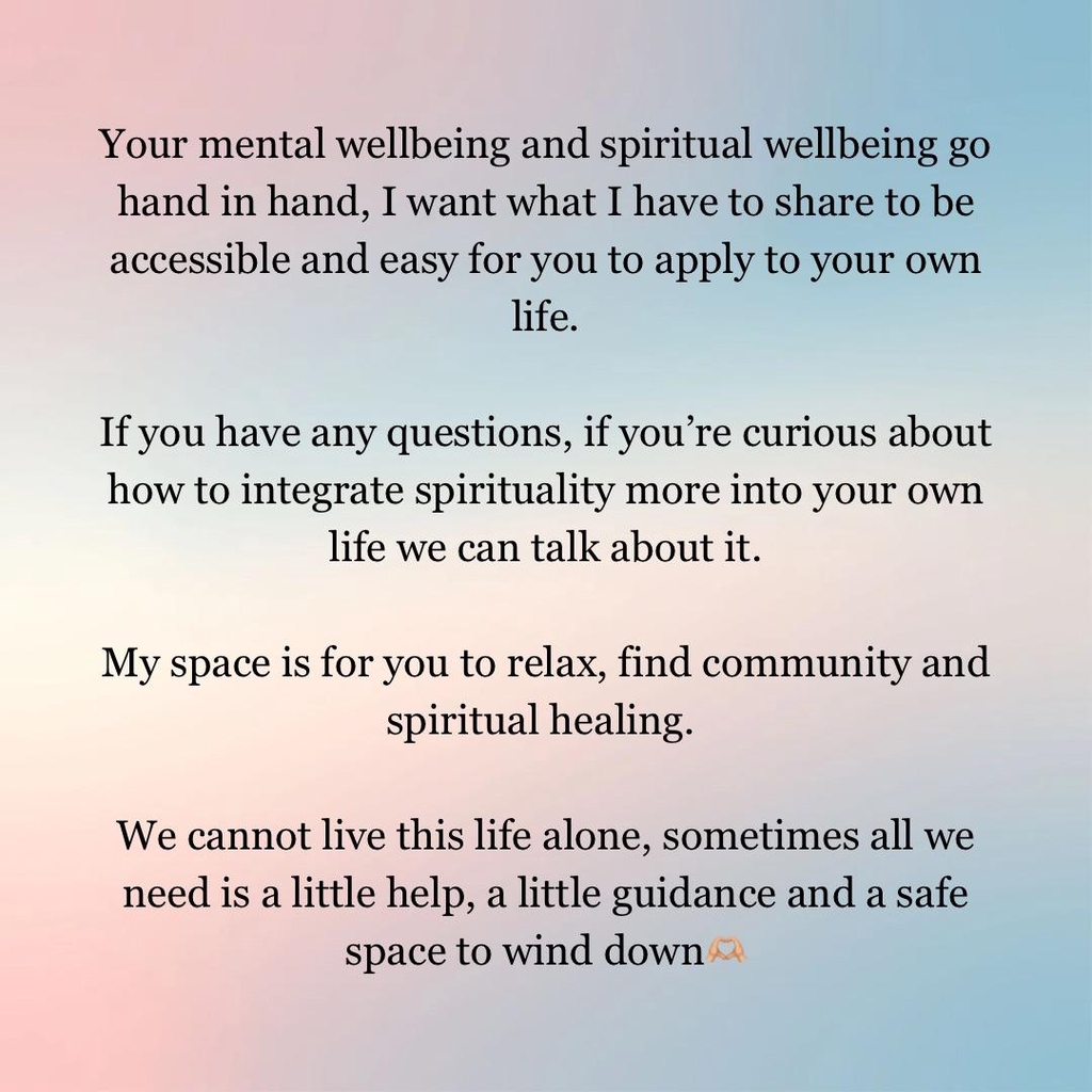 Spiritual wellbeing is just as important as your physical wellbeing, my Reiki sessions are a safe space for you to heal, reset, to help you better your life and find clarity.